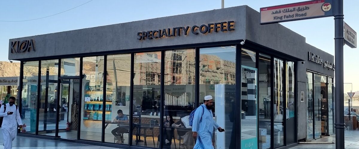 Café de spécialité devant le Masjid Nabawi. Flat white, Spanish latte, lait d'avoine disponible. Idéal après la prière. Prix ~20 SAR.
