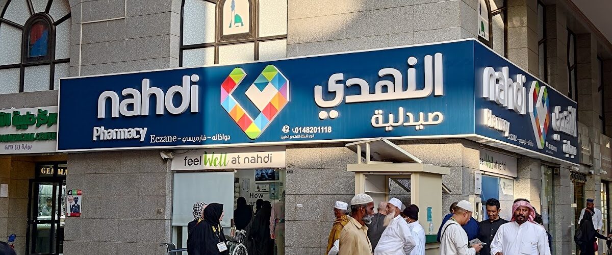 Pharmacie Nahdi à côté de la porte 330 du Masjid Nabawi. Pratique pour les pèlerins. Médicaments sur ordonnance et OTC.